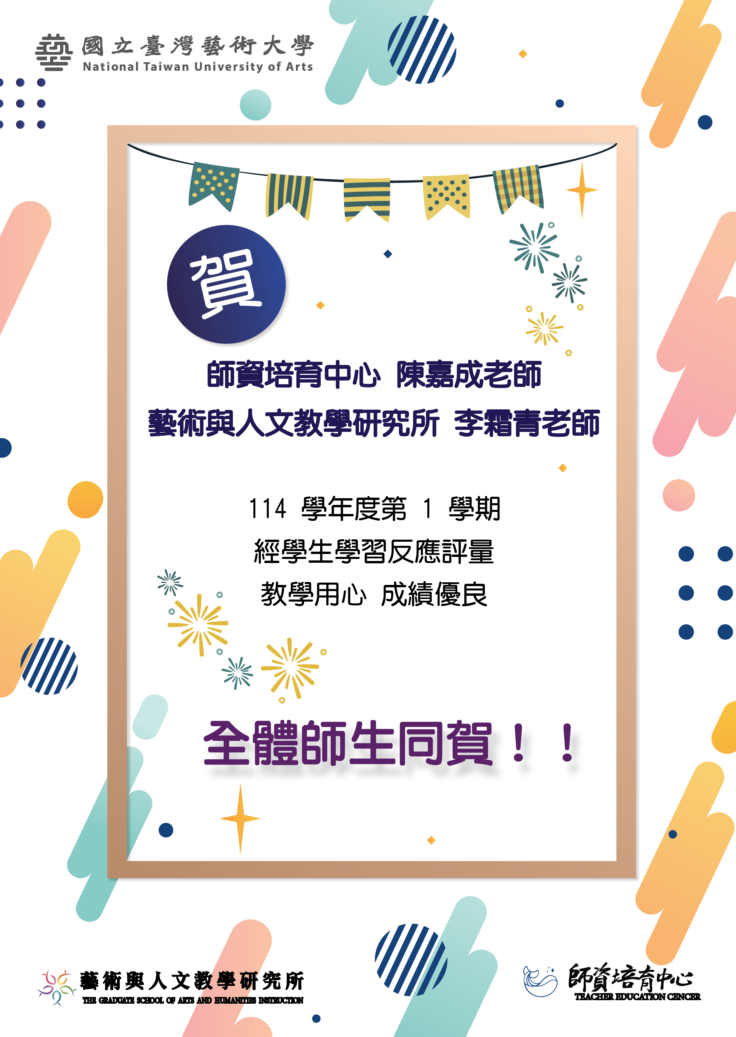 02月 24 114 學年度第 1 學期教師教學滿意獲獎資訊 2026-02-24 恭賀! 本所李霜青老師及師資培育中心陳嘉成老師 榮獲114 學年度第 1 學期學生學習反應評量成績優良! 感謝老師們於教學上的用心! 全體師生同賀!!! 回列表