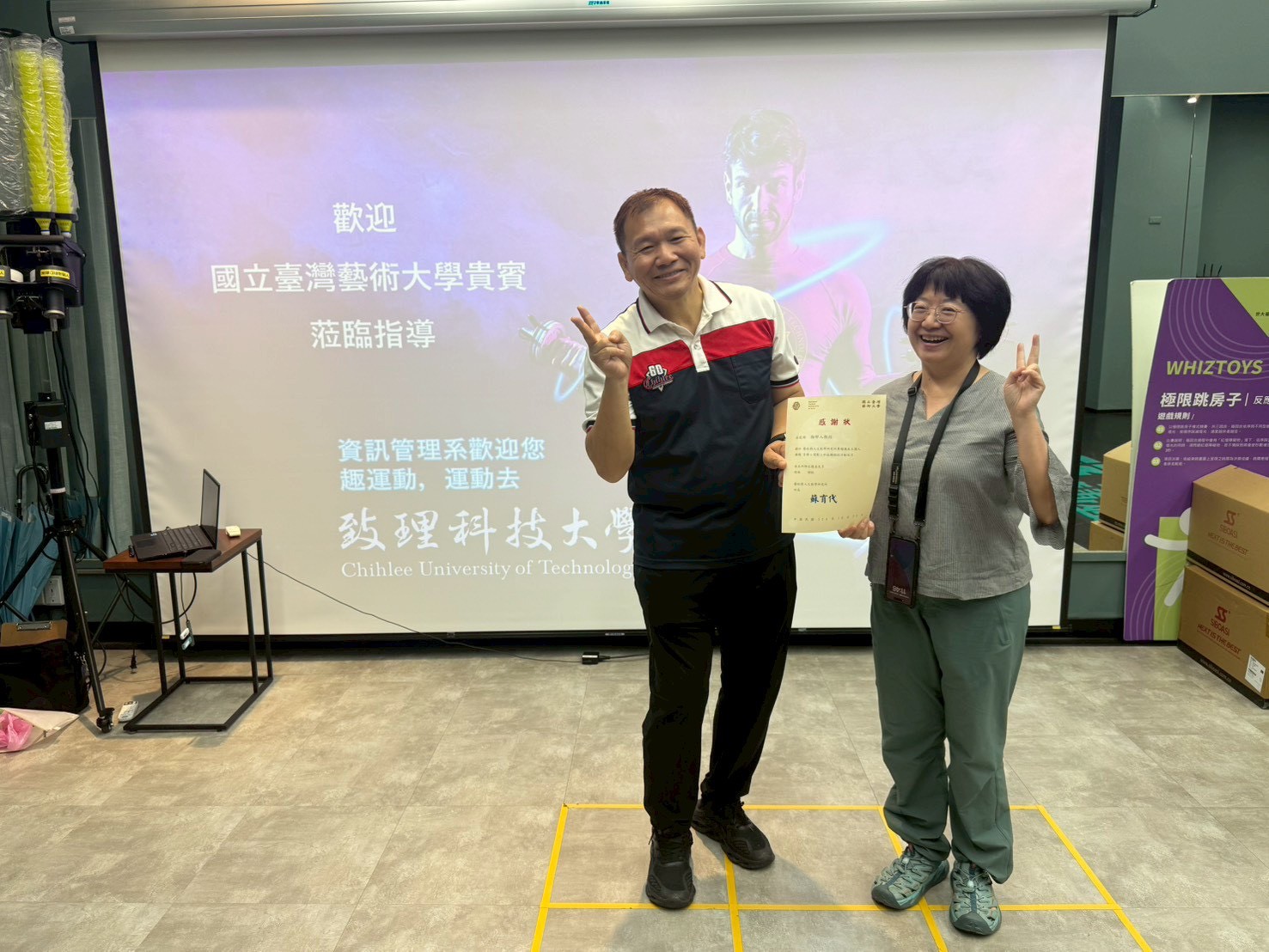 114年10月23日(四)由所長蘇育代老師,帶領所上同學赴致理科技大學參與由顏郁人教授講授「音樂×運動×科技輔助的活動設計」課程,整體講座課程以節奏牽動步伐、旋律營造情境、力度與音色整合,示範如何以音樂提升協調、專注與團隊互動。同時讓所上師生親自操作VR設備,透過參與遊戲的模式,體驗音樂、肢體律動與體能訓練結合的趣味,活動深受學生的好評,感謝講師為本所師生帶來如此有趣的課程內容! 相關新聞稿可參閱https://gahi.ntua.edu.tw/A01-1.asp?MH=1404