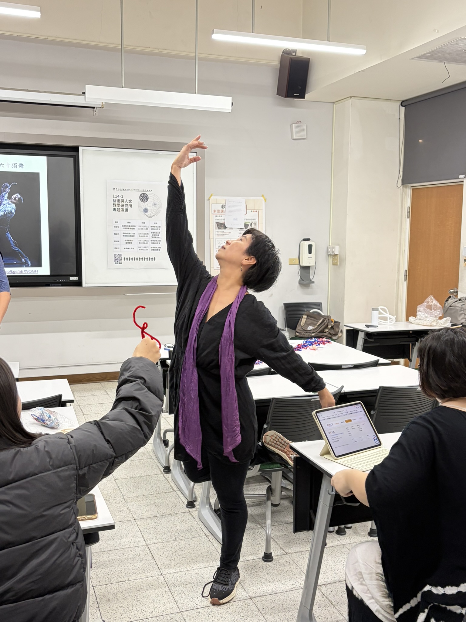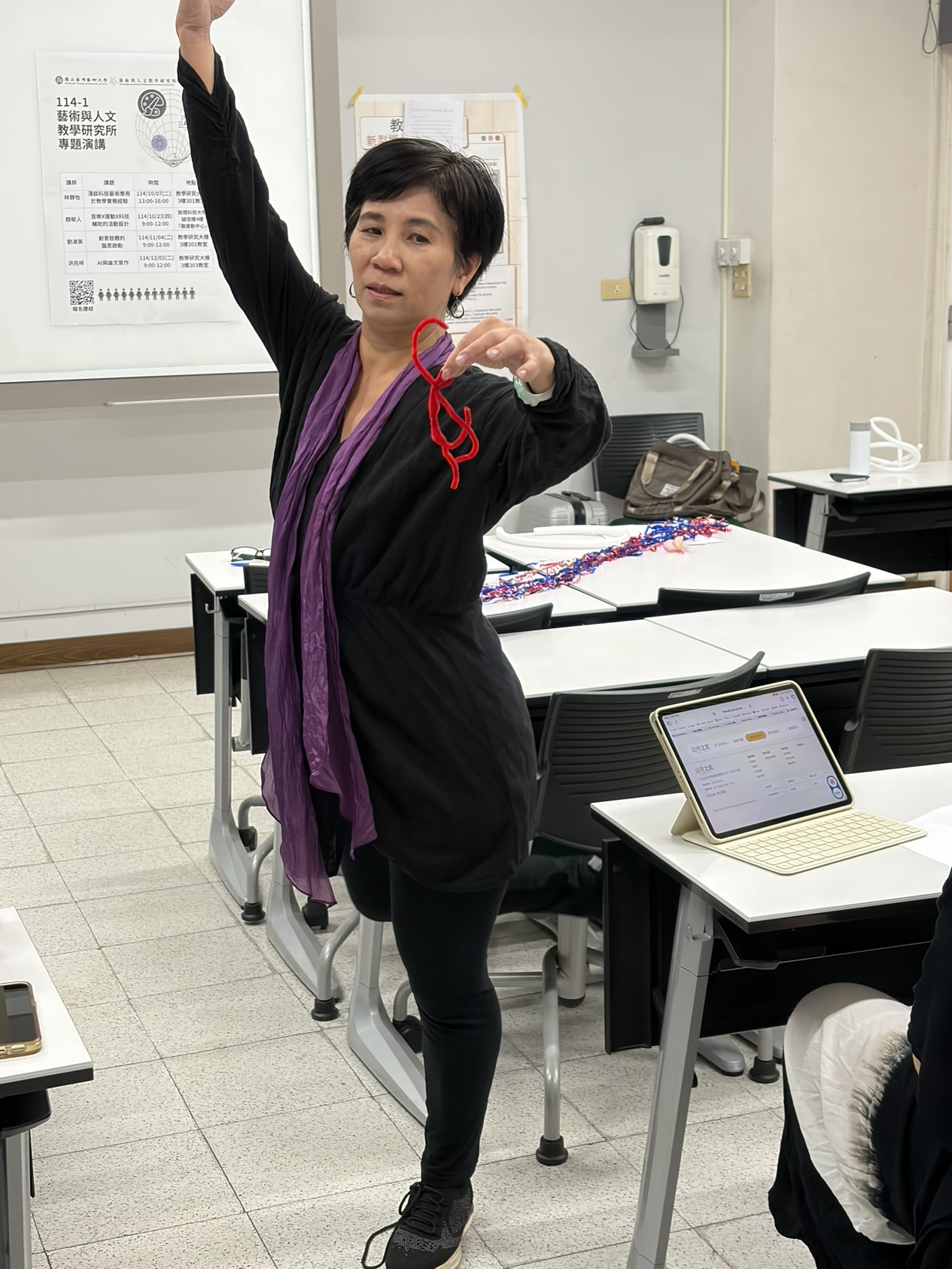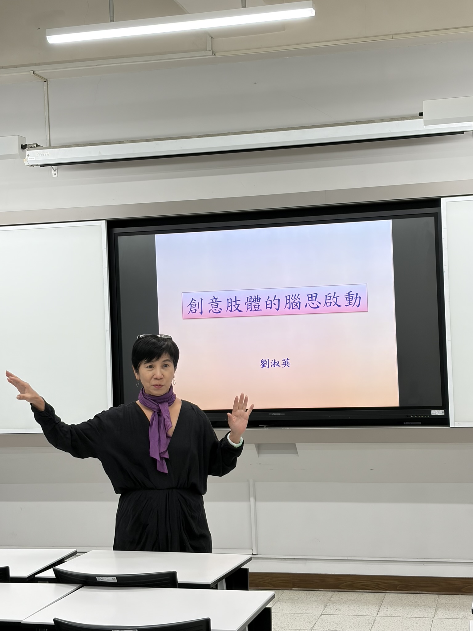 本學期第3場專題講座,於114年11月4日舉辦,邀請國立清華大學劉淑英教授,帶來主題為創意肢體的腦思啟動,透過舞蹈歷史脈絡的引導與舞蹈家的介紹,同時搭配肢體活動的進行,讓參與的師生都能體驗到,生活中隨處可得的一張紙,一條線或是一顆球,只要運用得當,都能成為展現個人肢體線條的好工具。經過講師的帶領,學生都充分展現與開啟個人肢體的線條感與美感,活動氣氛熱絡,感謝講師為所上學生所帶來的特殊體驗經歷!